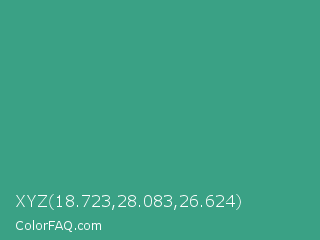 XYZ 18.723,28.083,26.624 Color is a normal cyan color and the nearest color is Zomp #39a78e. Hex code #3aa185 and RGB value is rgb(58,161,133). In RGB color space, this color is composed of 23% red, 63% green, 52% blue, In CMYK color space, this color is composed of 64% cyan, 0% magenta, 17% yellow , 37% black , In HSL color space, this color has a hue angle of 164° , 47% saturation and 43% lightness.