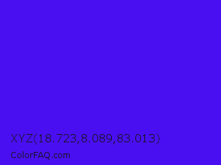 XYZ 18.723,8.089,83.013 Color is a normal indigo color and the nearest color is Han Purple #5218fa. Hex code #4a0ff0 and RGB value is rgb(74,15,240). In RGB color space, this color is composed of 29% red, 6% green, 94% blue, In CMYK color space, this color is composed of 69% cyan, 94% magenta, 0% yellow , 6% black , In HSL color space, this color has a hue angle of 256° , 88% saturation and 50% lightness.