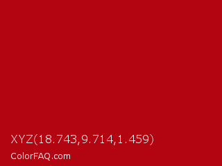 XYZ 18.743,9.714,1.459 Color is a normal red color and the nearest color is Bright Red #b10000. Hex code #b30412 and RGB value is rgb(179,4,18). In RGB color space, this color is composed of 70% red, 2% green, 7% blue, In CMYK color space, this color is composed of 0% cyan, 98% magenta, 90% yellow , 30% black , In HSL color space, this color has a hue angle of 355° , 96% saturation and 36% lightness.