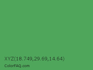 XYZ 18.749,29.69,14.64 Color is a normal green color and the nearest color is Fruit Salad #4f9d5d. Hex code #4fa65b and RGB value is rgb(79,166,91). In RGB color space, this color is composed of 31% red, 65% green, 36% blue, In CMYK color space, this color is composed of 52% cyan, 0% magenta, 45% yellow , 35% black , In HSL color space, this color has a hue angle of 128° , 36% saturation and 48% lightness.