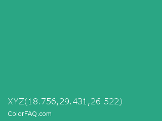 XYZ 18.756,29.431,26.522 Color is a normal cyan color and the nearest color is Jungle Green #29ab87. Hex code #2aa684 and RGB value is rgb(42,166,132). In RGB color space, this color is composed of 16% red, 65% green, 52% blue, In CMYK color space, this color is composed of 75% cyan, 0% magenta, 20% yellow , 35% black , In HSL color space, this color has a hue angle of 164° , 60% saturation and 41% lightness.