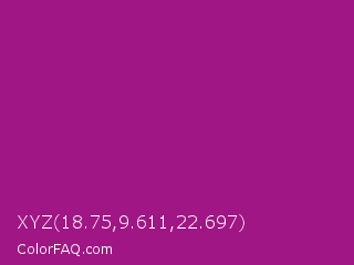 XYZ 18.75,9.611,22.697 Color is a normal magenta color and the nearest color is Violet Eggplant #991199. Hex code #9f1684 and RGB value is rgb(159,22,132). In RGB color space, this color is composed of 62% red, 9% green, 52% blue, In CMYK color space, this color is composed of 0% cyan, 86% magenta, 17% yellow , 38% black , In HSL color space, this color has a hue angle of 312° , 76% saturation and 35% lightness.