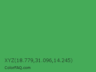 XYZ 18.779,31.096,14.245 Color is a normal green color and the nearest color is Chateau Green #40a860. Hex code #45ab58 and RGB value is rgb(69,171,88). In RGB color space, this color is composed of 27% red, 67% green, 35% blue, In CMYK color space, this color is composed of 60% cyan, 0% magenta, 49% yellow , 33% black , In HSL color space, this color has a hue angle of 131° , 43% saturation and 47% lightness.