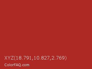 XYZ 18.791,10.827,2.769 Color is a normal red color and the nearest color is Tall Poppy #b32d29. Hex code #af2924 and RGB value is rgb(175,41,36). In RGB color space, this color is composed of 69% red, 16% green, 14% blue, In CMYK color space, this color is composed of 0% cyan, 77% magenta, 79% yellow , 31% black , In HSL color space, this color has a hue angle of 2° , 66% saturation and 41% lightness.