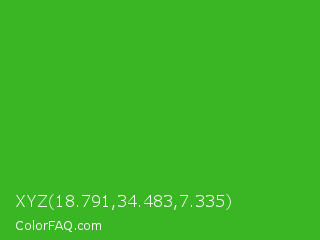 XYZ 18.791,34.483,7.335 Color is a normal green color and the nearest color is Wageningen Green #34b233. Hex code #3ab624 and RGB value is rgb(58,182,36). In RGB color space, this color is composed of 23% red, 71% green, 14% blue, In CMYK color space, this color is composed of 68% cyan, 0% magenta, 80% yellow , 29% black , In HSL color space, this color has a hue angle of 111° , 67% saturation and 43% lightness.