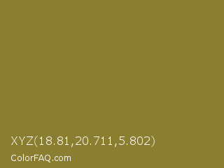 XYZ 18.81,20.711,5.802 Color is a normal yellow color and the nearest color is Old Moss Green #867e36. Hex code #8c7e30 and RGB value is rgb(140,126,48). In RGB color space, this color is composed of 55% red, 49% green, 19% blue, In CMYK color space, this color is composed of 0% cyan, 10% magenta, 66% yellow , 45% black , In HSL color space, this color has a hue angle of 51° , 49% saturation and 37% lightness.