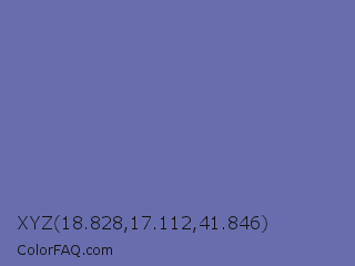 XYZ 18.828,17.112,41.846 Color is a normal blue color and the nearest color is Scampi #675fa6. Hex code #686ead and RGB value is rgb(104,110,173). In RGB color space, this color is composed of 41% red, 43% green, 68% blue, In CMYK color space, this color is composed of 40% cyan, 36% magenta, 0% yellow , 32% black , In HSL color space, this color has a hue angle of 235° , 30% saturation and 54% lightness.