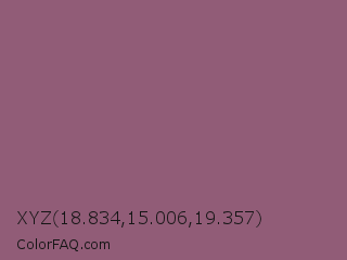 XYZ 18.834,15.006,19.357 Color is a normal rose color and the nearest color is Mauve Taupe #915f6d. Hex code #915c77 and RGB value is rgb(145,92,119). In RGB color space, this color is composed of 57% red, 36% green, 47% blue, In CMYK color space, this color is composed of 0% cyan, 37% magenta, 18% yellow , 43% black , In HSL color space, this color has a hue angle of 329° , 22% saturation and 46% lightness.
