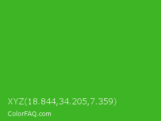 XYZ 18.844,34.205,7.359 Color is a normal green color and the nearest color is Wageningen Green #34b233. Hex code #3eb525 and RGB value is rgb(62,181,37). In RGB color space, this color is composed of 24% red, 71% green, 15% blue, In CMYK color space, this color is composed of 66% cyan, 0% magenta, 80% yellow , 29% black , In HSL color space, this color has a hue angle of 110° , 66% saturation and 43% lightness.