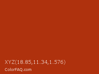 XYZ 18.85,11.34,1.576 Color is a normal red color and the nearest color is Rust #b7410e. Hex code #af310d and RGB value is rgb(175,49,13). In RGB color space, this color is composed of 69% red, 19% green, 5% blue, In CMYK color space, this color is composed of 0% cyan, 72% magenta, 93% yellow , 31% black , In HSL color space, this color has a hue angle of 13° , 86% saturation and 37% lightness.