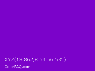 XYZ 18.862,8.54,56.531 Color is a normal purple color and the nearest color is French Violet #8806ce. Hex code #7b03ca and RGB value is rgb(123,3,202). In RGB color space, this color is composed of 48% red, 1% green, 79% blue, In CMYK color space, this color is composed of 39% cyan, 99% magenta, 0% yellow , 21% black , In HSL color space, this color has a hue angle of 276° , 97% saturation and 40% lightness.