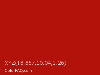 XYZ 18.867,10.04,1.26 Color is a normal red color and the nearest color is International Orange Engineering #ba160c. Hex code #b3120b and RGB value is rgb(179,18,11). In RGB color space, this color is composed of 70% red, 7% green, 4% blue, In CMYK color space, this color is composed of 0% cyan, 90% magenta, 94% yellow , 30% black , In HSL color space, this color has a hue angle of 3° , 88% saturation and 37% lightness.
