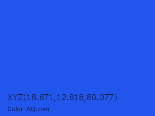 XYZ 18.871,12.818,80.077 Color is a normal blue color and the nearest color is Palatinate Blue #273be2. Hex code #2155eb and RGB value is rgb(33,85,235). In RGB color space, this color is composed of 13% red, 33% green, 92% blue, In CMYK color space, this color is composed of 86% cyan, 64% magenta, 0% yellow , 8% black , In HSL color space, this color has a hue angle of 225° , 83% saturation and 53% lightness.