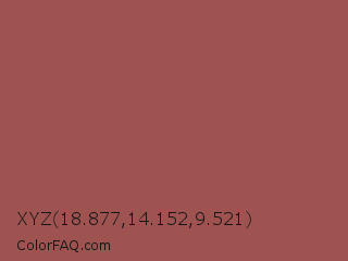XYZ 18.877,14.152,9.521 Color is a normal red color and the nearest color is Middle Red Purple #a55353. Hex code #9f5351 and RGB value is rgb(159,83,81). In RGB color space, this color is composed of 62% red, 33% green, 32% blue, In CMYK color space, this color is composed of 0% cyan, 48% magenta, 49% yellow , 38% black , In HSL color space, this color has a hue angle of 2° , 33% saturation and 47% lightness.