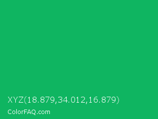 XYZ 18.879,34.012,16.879 Color is a normal green color and the nearest color is GO Green #00ab66. Hex code #0fb561 and RGB value is rgb(15,181,97). In RGB color space, this color is composed of 6% red, 71% green, 38% blue, In CMYK color space, this color is composed of 92% cyan, 0% magenta, 46% yellow , 29% black , In HSL color space, this color has a hue angle of 150° , 85% saturation and 38% lightness.