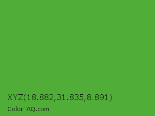 XYZ 18.882,31.835,8.891 Color is a normal green color and the nearest color is Apple #4fa83d. Hex code #4fad38 and RGB value is rgb(79,173,56). In RGB color space, this color is composed of 31% red, 68% green, 22% blue, In CMYK color space, this color is composed of 54% cyan, 0% magenta, 68% yellow , 32% black , In HSL color space, this color has a hue angle of 108° , 51% saturation and 45% lightness.