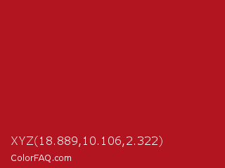 XYZ 18.889,10.106,2.322 Color is a normal red color and the nearest color is Carnelian #b31b1b. Hex code #b21520 and RGB value is rgb(178,21,32). In RGB color space, this color is composed of 70% red, 8% green, 13% blue, In CMYK color space, this color is composed of 0% cyan, 88% magenta, 82% yellow , 30% black , In HSL color space, this color has a hue angle of 356° , 79% saturation and 39% lightness.