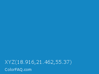 XYZ 18.916,21.462,55.37 Color is a normal blue color and the nearest color is Cyan Cornflower Blue #188bc2. Hex code #1487c4 and RGB value is rgb(20,135,196). In RGB color space, this color is composed of 8% red, 53% green, 77% blue, In CMYK color space, this color is composed of 90% cyan, 31% magenta, 0% yellow , 23% black , In HSL color space, this color has a hue angle of 201° , 81% saturation and 42% lightness.