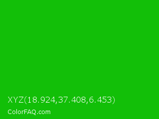 XYZ 18.924,37.408,6.453 Color is a normal green color and the nearest color is Vivid Malachite #00cc33. Hex code #12bf08 and RGB value is rgb(18,191,8). In RGB color space, this color is composed of 7% red, 75% green, 3% blue, In CMYK color space, this color is composed of 91% cyan, 0% magenta, 96% yellow , 25% black , In HSL color space, this color has a hue angle of 117° , 92% saturation and 39% lightness.