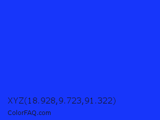 XYZ 18.928,9.723,91.322 Color is a normal blue color and the nearest color is Blue RYB #0247fe. Hex code #1736fa and RGB value is rgb(23,54,250). In RGB color space, this color is composed of 9% red, 21% green, 98% blue, In CMYK color space, this color is composed of 91% cyan, 78% magenta, 0% yellow , 2% black , In HSL color space, this color has a hue angle of 232° , 96% saturation and 54% lightness.
