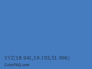 XYZ 18.941,19.193,51.996 Color is a normal blue color and the nearest color is Cyan Blue Azure #4682bf. Hex code #457bbf and RGB value is rgb(69,123,191). In RGB color space, this color is composed of 27% red, 48% green, 75% blue, In CMYK color space, this color is composed of 64% cyan, 36% magenta, 0% yellow , 25% black , In HSL color space, this color has a hue angle of 213° , 49% saturation and 51% lightness.