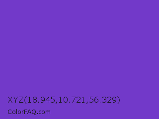 XYZ 18.945,10.721,56.329 Color is a normal violet color and the nearest color is Purple Heart Crayola #652dc1. Hex code #7239c9 and RGB value is rgb(114,57,201). In RGB color space, this color is composed of 45% red, 22% green, 79% blue, In CMYK color space, this color is composed of 43% cyan, 72% magenta, 0% yellow , 21% black , In HSL color space, this color has a hue angle of 264° , 57% saturation and 51% lightness.