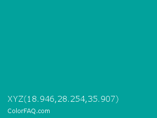 XYZ 18.946,28.254,35.907 Color is a normal cyan color and the nearest color is Persian Green #00a693. Hex code #02a29c and RGB value is rgb(2,162,156). In RGB color space, this color is composed of 1% red, 64% green, 61% blue, In CMYK color space, this color is composed of 99% cyan, 0% magenta, 4% yellow , 36% black , In HSL color space, this color has a hue angle of 178° , 98% saturation and 32% lightness.