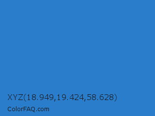 XYZ 18.949,19.424,58.628 Color is a normal blue color and the nearest color is Mariner #286acd. Hex code #2a7dca and RGB value is rgb(42,125,202). In RGB color space, this color is composed of 16% red, 49% green, 79% blue, In CMYK color space, this color is composed of 79% cyan, 38% magenta, 0% yellow , 21% black , In HSL color space, this color has a hue angle of 209° , 66% saturation and 48% lightness.