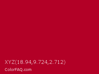 XYZ 18.94,9.724,2.712 Color is a normal red color and the nearest color is Alabama Crimson #af002a. Hex code #b30026 and RGB value is rgb(179,0,38). In RGB color space, this color is composed of 70% red, 0% green, 15% blue, In CMYK color space, this color is composed of 0% cyan, 100% magenta, 79% yellow , 30% black , In HSL color space, this color has a hue angle of 347° , 100% saturation and 35% lightness.