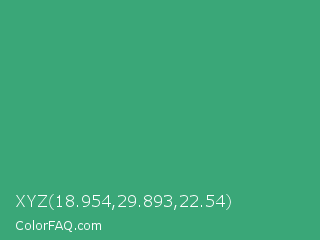 XYZ 18.954,29.893,22.54 Color is a normal green color and the nearest color is Ocean Green #41aa78. Hex code #3aa778 and RGB value is rgb(58,167,120). In RGB color space, this color is composed of 23% red, 65% green, 47% blue, In CMYK color space, this color is composed of 65% cyan, 0% magenta, 28% yellow , 35% black , In HSL color space, this color has a hue angle of 154° , 48% saturation and 44% lightness.