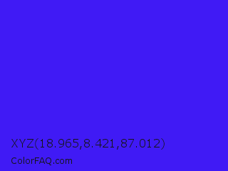 XYZ 18.965,8.421,87.012 Color is a normal indigo color and the nearest color is Han Purple #5218fa. Hex code #401af5 and RGB value is rgb(64,26,245). In RGB color space, this color is composed of 25% red, 10% green, 96% blue, In CMYK color space, this color is composed of 74% cyan, 89% magenta, 0% yellow , 4% black , In HSL color space, this color has a hue angle of 250° , 92% saturation and 53% lightness.