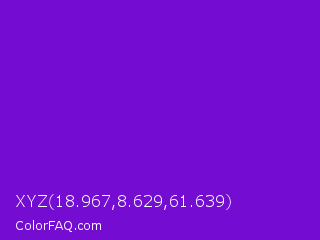 XYZ 18.967,8.629,61.639 Color is a normal purple color and the nearest color is French Violet #8806ce. Hex code #740cd2 and RGB value is rgb(116,12,210). In RGB color space, this color is composed of 45% red, 5% green, 82% blue, In CMYK color space, this color is composed of 45% cyan, 94% magenta, 0% yellow , 18% black , In HSL color space, this color has a hue angle of 272° , 89% saturation and 44% lightness.