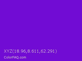 XYZ 18.96,8.611,62.291 Color is a normal purple color and the nearest color is French Violet #8806ce. Hex code #730cd3 and RGB value is rgb(115,12,211). In RGB color space, this color is composed of 45% red, 5% green, 83% blue, In CMYK color space, this color is composed of 45% cyan, 94% magenta, 0% yellow , 17% black , In HSL color space, this color has a hue angle of 271° , 89% saturation and 44% lightness.