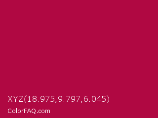 XYZ 18.975,9.797,6.045 Color is a normal rose color and the nearest color is Shiraz #b20931. Hex code #b00842 and RGB value is rgb(176,8,66). In RGB color space, this color is composed of 69% red, 3% green, 26% blue, In CMYK color space, this color is composed of 0% cyan, 95% magenta, 63% yellow , 31% black , In HSL color space, this color has a hue angle of 339° , 91% saturation and 36% lightness.