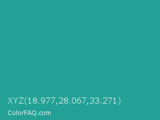 XYZ 18.977,28.067,33.271 Color is a normal cyan color and the nearest color is Jungle Green #29ab87. Hex code #24a196 and RGB value is rgb(36,161,150). In RGB color space, this color is composed of 14% red, 63% green, 59% blue, In CMYK color space, this color is composed of 78% cyan, 0% magenta, 7% yellow , 37% black , In HSL color space, this color has a hue angle of 175° , 63% saturation and 39% lightness.