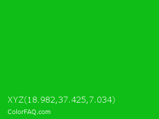 XYZ 18.982,37.425,7.034 Color is a normal green color and the nearest color is Vivid Malachite #00cc33. Hex code #0fbf17 and RGB value is rgb(15,191,23). In RGB color space, this color is composed of 6% red, 75% green, 9% blue, In CMYK color space, this color is composed of 92% cyan, 0% magenta, 88% yellow , 25% black , In HSL color space, this color has a hue angle of 123° , 85% saturation and 40% lightness.