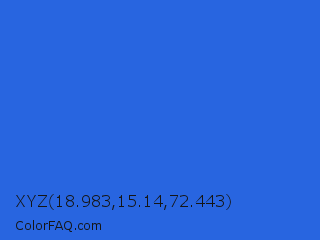XYZ 18.983,15.14,72.443 Color is a normal blue color and the nearest color is Mariner #286acd. Hex code #2865e0 and RGB value is rgb(40,101,224). In RGB color space, this color is composed of 16% red, 40% green, 88% blue, In CMYK color space, this color is composed of 82% cyan, 55% magenta, 0% yellow , 12% black , In HSL color space, this color has a hue angle of 220° , 75% saturation and 52% lightness.