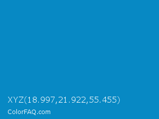 XYZ 18.997,21.922,55.455 Color is a normal blue color and the nearest color is Blue NCS #0087bd. Hex code #0789c4 and RGB value is rgb(7,137,196). In RGB color space, this color is composed of 3% red, 54% green, 77% blue, In CMYK color space, this color is composed of 96% cyan, 30% magenta, 0% yellow , 23% black , In HSL color space, this color has a hue angle of 199° , 93% saturation and 40% lightness.