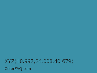 XYZ 18.997,24.008,40.679 Color is a normal cyan color and the nearest color is Boston Blue #3b91b4. Hex code #3b91a8 and RGB value is rgb(59,145,168). In RGB color space, this color is composed of 23% red, 57% green, 66% blue, In CMYK color space, this color is composed of 65% cyan, 14% magenta, 0% yellow , 34% black , In HSL color space, this color has a hue angle of 193° , 48% saturation and 45% lightness.