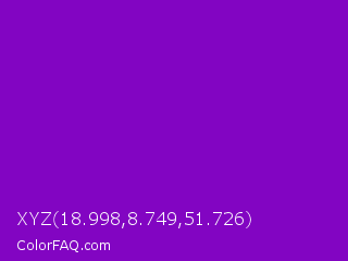 XYZ 18.998,8.749,51.726 Color is a normal purple color and the nearest color is French Violet #8806ce. Hex code #8205c2 and RGB value is rgb(130,5,194). In RGB color space, this color is composed of 51% red, 2% green, 76% blue, In CMYK color space, this color is composed of 33% cyan, 97% magenta, 0% yellow , 24% black , In HSL color space, this color has a hue angle of 280° , 95% saturation and 39% lightness.