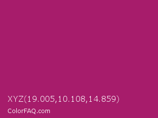 XYZ 19.005,10.108,14.859 Color is a normal magenta color and the nearest color is Amaranth Deep Purple #9f2b68. Hex code #a71c6b and RGB value is rgb(167,28,107). In RGB color space, this color is composed of 65% red, 11% green, 42% blue, In CMYK color space, this color is composed of 0% cyan, 83% magenta, 36% yellow , 35% black , In HSL color space, this color has a hue angle of 326° , 71% saturation and 38% lightness.