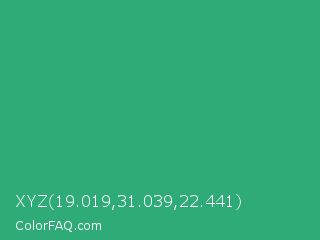 XYZ 19.019,31.039,22.441 Color is a normal green color and the nearest color is Jungle Green #29ab87. Hex code #2eab77 and RGB value is rgb(46,171,119). In RGB color space, this color is composed of 18% red, 67% green, 47% blue, In CMYK color space, this color is composed of 73% cyan, 0% magenta, 30% yellow , 33% black , In HSL color space, this color has a hue angle of 155° , 58% saturation and 43% lightness.