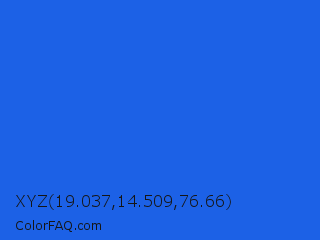 XYZ 19.037,14.509,76.66 Color is a normal blue color and the nearest color is Bright Navy Blue #1974d2. Hex code #1c61e6 and RGB value is rgb(28,97,230). In RGB color space, this color is composed of 11% red, 38% green, 90% blue, In CMYK color space, this color is composed of 88% cyan, 58% magenta, 0% yellow , 10% black , In HSL color space, this color has a hue angle of 220° , 80% saturation and 51% lightness.