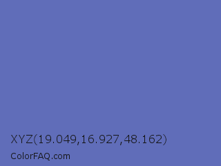 XYZ 19.049,16.927,48.162 Color is a normal blue color and the nearest color is Toolbox #746cc0. Hex code #606db9 and RGB value is rgb(96,109,185). In RGB color space, this color is composed of 38% red, 43% green, 73% blue, In CMYK color space, this color is composed of 48% cyan, 41% magenta, 0% yellow , 27% black , In HSL color space, this color has a hue angle of 231° , 39% saturation and 55% lightness.