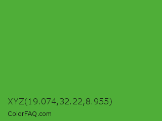 XYZ 19.074,32.22,8.955 Color is a normal green color and the nearest color is Apple #4fa83d. Hex code #4fae38 and RGB value is rgb(79,174,56). In RGB color space, this color is composed of 31% red, 68% green, 22% blue, In CMYK color space, this color is composed of 55% cyan, 0% magenta, 68% yellow , 32% black , In HSL color space, this color has a hue angle of 108° , 51% saturation and 45% lightness.