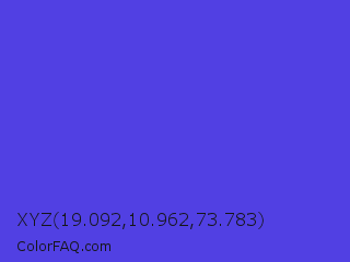 XYZ 19.092,10.962,73.783 Color is a normal indigo color and the nearest color is Majorelle Blue #6050dc. Hex code #5140e3 and RGB value is rgb(81,64,227). In RGB color space, this color is composed of 32% red, 25% green, 89% blue, In CMYK color space, this color is composed of 64% cyan, 72% magenta, 0% yellow , 11% black , In HSL color space, this color has a hue angle of 246° , 74% saturation and 57% lightness.