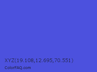 XYZ 19.108,12.695,70.551 Color is a normal blue color and the nearest color is Majorelle Blue #6050dc. Hex code #4c51de and RGB value is rgb(76,81,222). In RGB color space, this color is composed of 30% red, 32% green, 87% blue, In CMYK color space, this color is composed of 66% cyan, 64% magenta, 0% yellow , 13% black , In HSL color space, this color has a hue angle of 238° , 69% saturation and 58% lightness.
