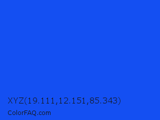 XYZ 19.111,12.151,85.343 Color is a normal blue color and the nearest color is Blue RYB #0247fe. Hex code #144ff2 and RGB value is rgb(20,79,242). In RGB color space, this color is composed of 8% red, 31% green, 95% blue, In CMYK color space, this color is composed of 92% cyan, 67% magenta, 0% yellow , 5% black , In HSL color space, this color has a hue angle of 224° , 90% saturation and 51% lightness.