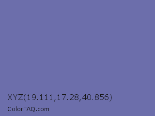 XYZ 19.111,17.28,40.856 Color is a normal blue color and the nearest color is Kimberly #736c9f. Hex code #6c6eab and RGB value is rgb(108,110,171). In RGB color space, this color is composed of 42% red, 43% green, 67% blue, In CMYK color space, this color is composed of 37% cyan, 36% magenta, 0% yellow , 33% black , In HSL color space, this color has a hue angle of 238° , 27% saturation and 55% lightness.