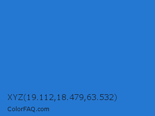 XYZ 19.112,18.479,63.532 Color is a normal blue color and the nearest color is Bright Navy Blue #1974d2. Hex code #2578d2 and RGB value is rgb(37,120,210). In RGB color space, this color is composed of 15% red, 47% green, 82% blue, In CMYK color space, this color is composed of 82% cyan, 43% magenta, 0% yellow , 18% black , In HSL color space, this color has a hue angle of 211° , 70% saturation and 48% lightness.